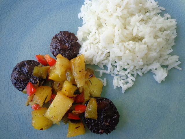 Preparação: – Comece por aquecer uma frigideira e junte a morcela cortada às rodelas. – Entretanto corte o ananás ao meio e retire a polpa de uma das metades e reserve a casca. – De seguida, adicione ½ ananás aos cubos, ½ pimento vermelho aos cubos e ½ pimento verde aos cubos, cortados aos cubos com a mandolina V3 da Borner. Adicione salva picada e folhas de tomilho. Deixe os sabores apurarem.