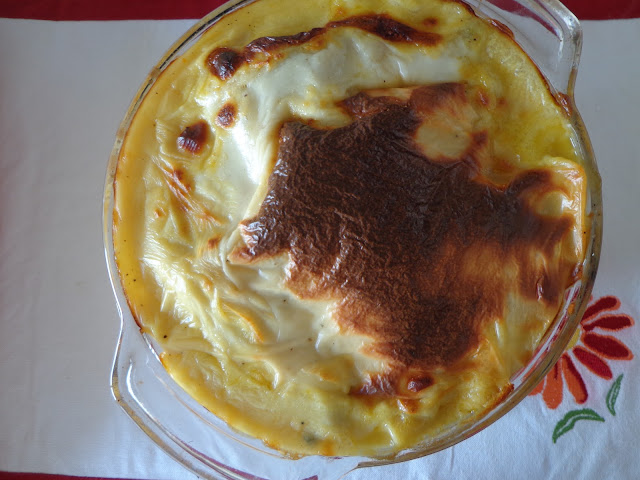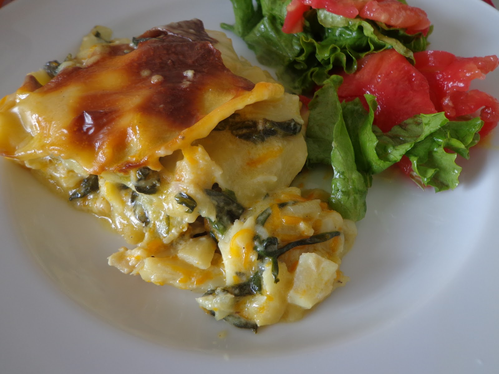 – Depois monte a lasanha a gosto fazendo várias camadas de molho branco, placas de lasanha e o preparado do bacalhau com os espinafres e a cenoura.