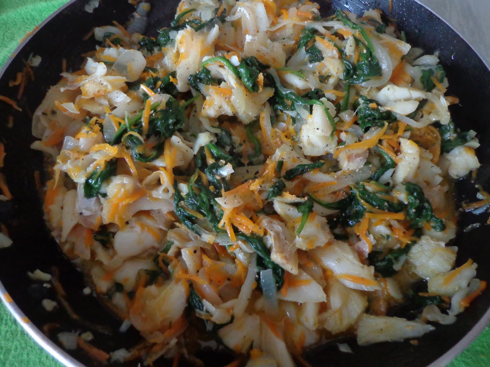 – Entretanto junte o bacalhau, que entretanto desfiou. Envolva bem e deixe estar em lume brando uns minutinhos.