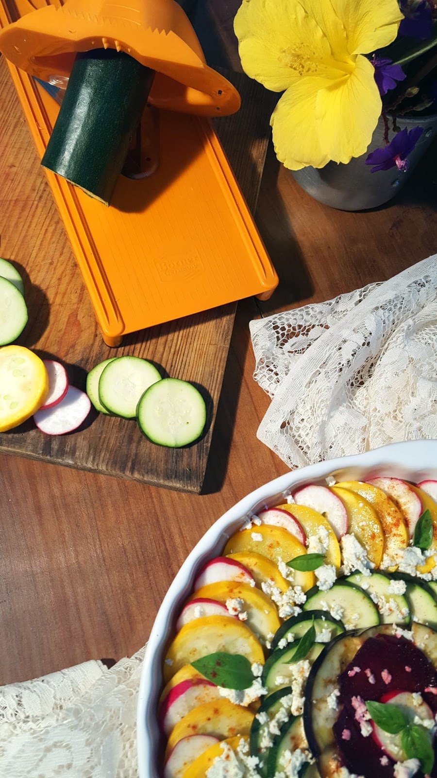 Em seguida corte os legumes em círculos com a ajuda da faca ou mandolina (usei a V3 da Borner) – as courgettes, beringela, rabanetes, cebola. Corte a beringela no sentido longitudinal para obter meias luas.