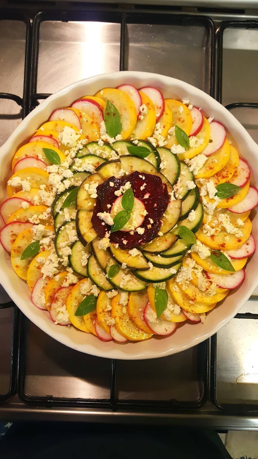 De seguida, vá dispondo à volta da travessa rodelas de courgette amarela intercaladas com rodelas de rabanete. No círculos seguinte disponha as rodelas de courgette verde. Na seguinte disponha as meias luas de beringela.